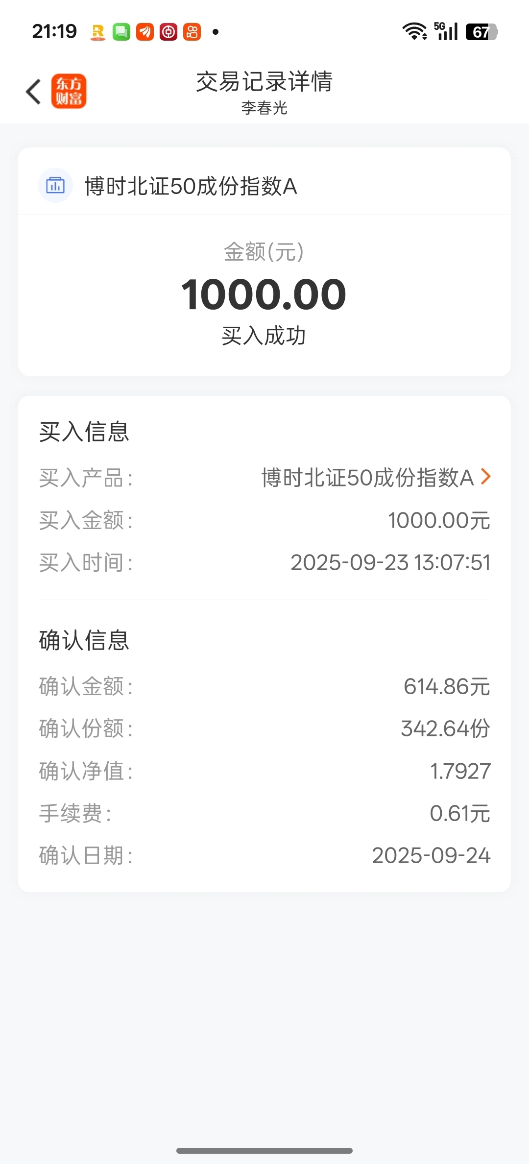 我申购1000元成功,怎么确认614.86元
