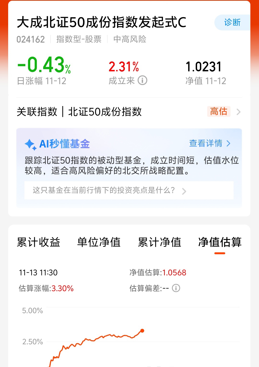 今天市场回暖,北证50指数大反弹。$大成北证50成份指数发起式C$ 估值3.3%,$博时北证50成份指数发起式C$ 估值3.47%。