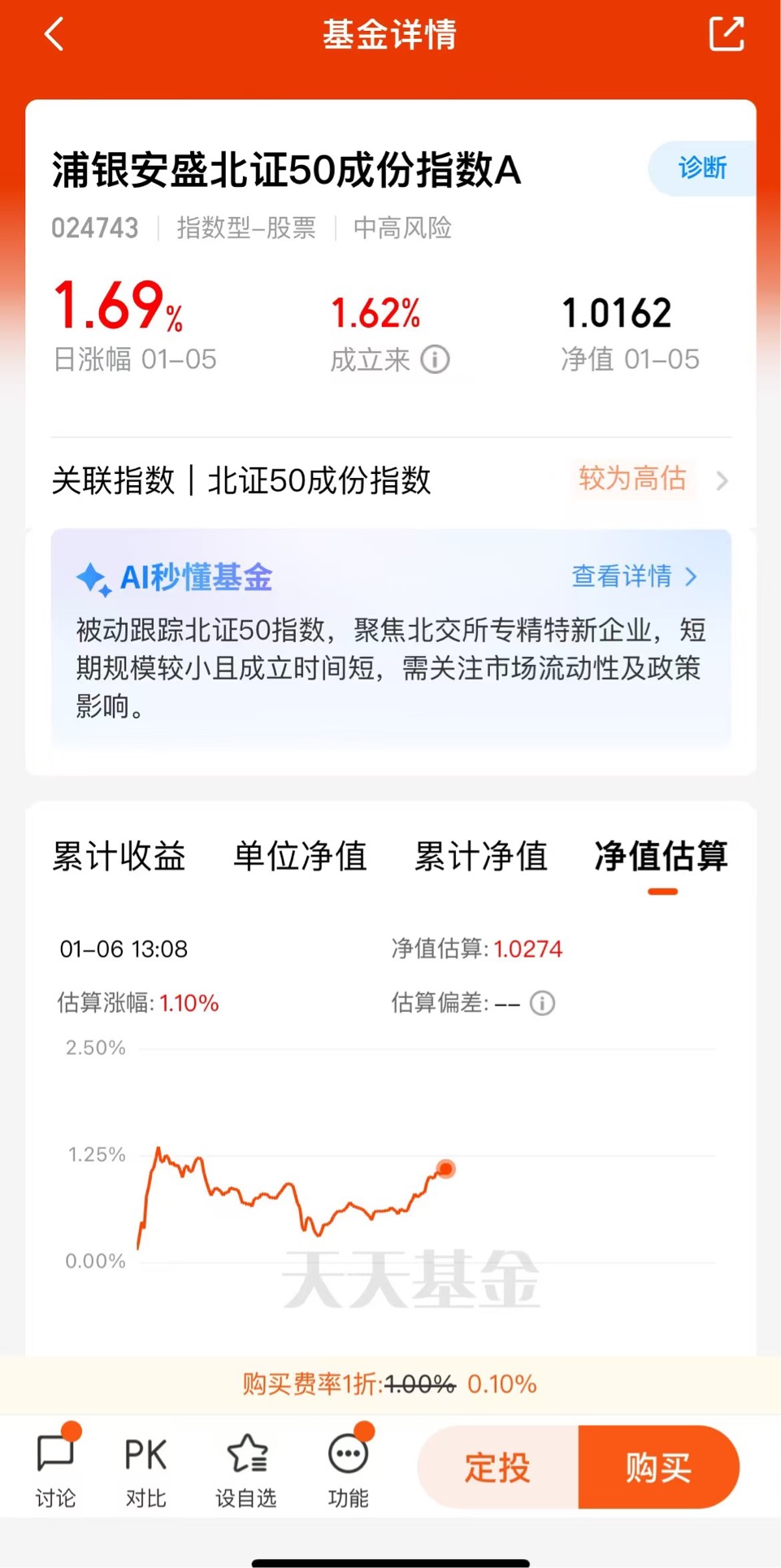 不限额的北证50给大家找到了,$浦银安盛北证50成份指数A$ 跟踪紧密,成立以来跑赢指数