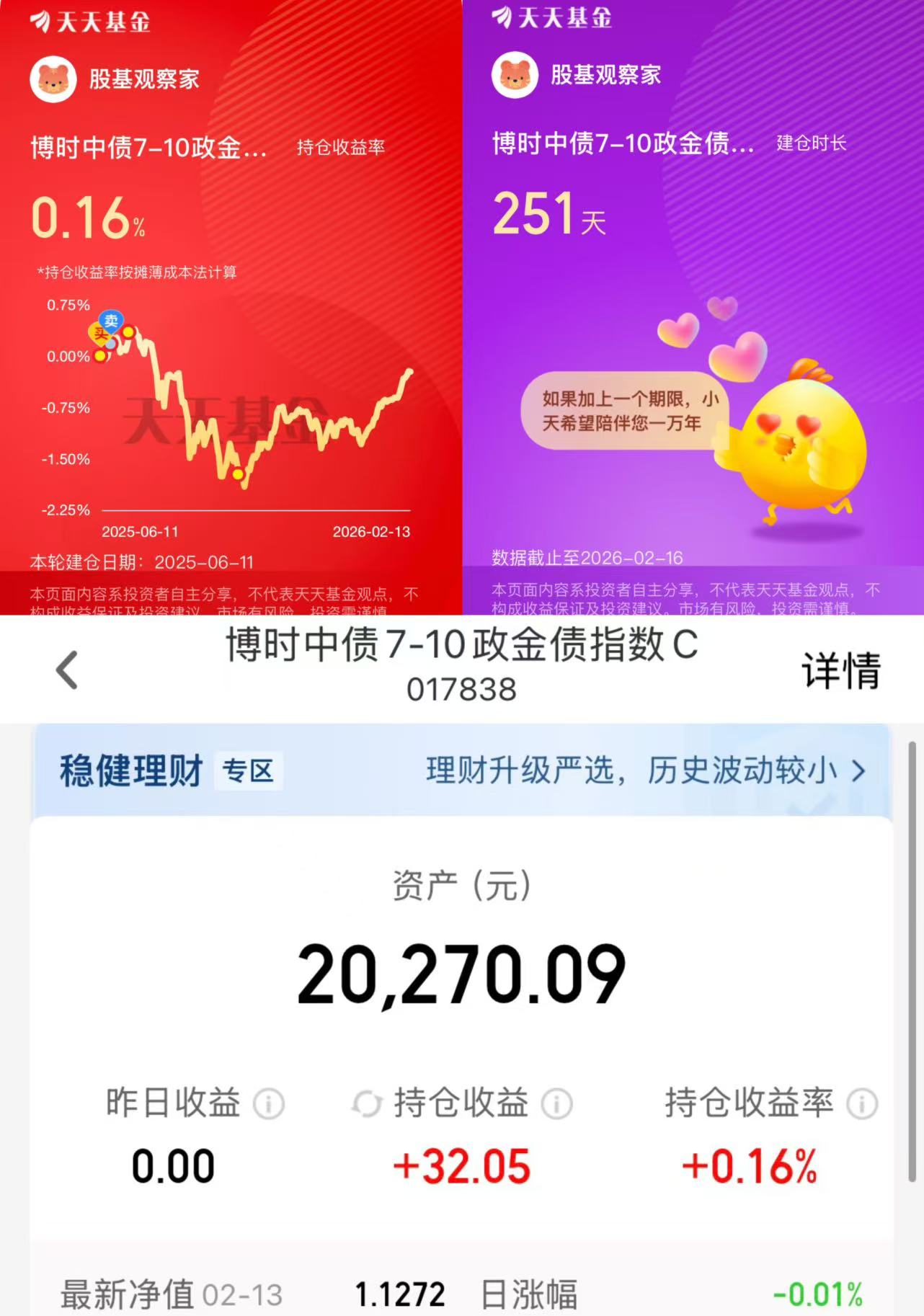 我不仅是这么想,更是这么做的,坚持“知行合一”,我对博时基金可谓是非常熟悉的,早就是老朋友了博时基金本身就是我最欣赏的基金公司。博时基金本身就是我最看好的国内公募基金公司中的领头羊,我对于博时基金的产品都是非常熟悉的。我早在半年多前就申购了博时基金的鲁邦旺和张磊经理的博时中债7-10证金债指数C(017838)基金,持仓额度也超过20000元,是目前我持仓额度最高的债券基金,虽然由于下半年债券市场的持续回调,历经186天至今尚未取得正收益,但我依然坚信,春种必然秋收!