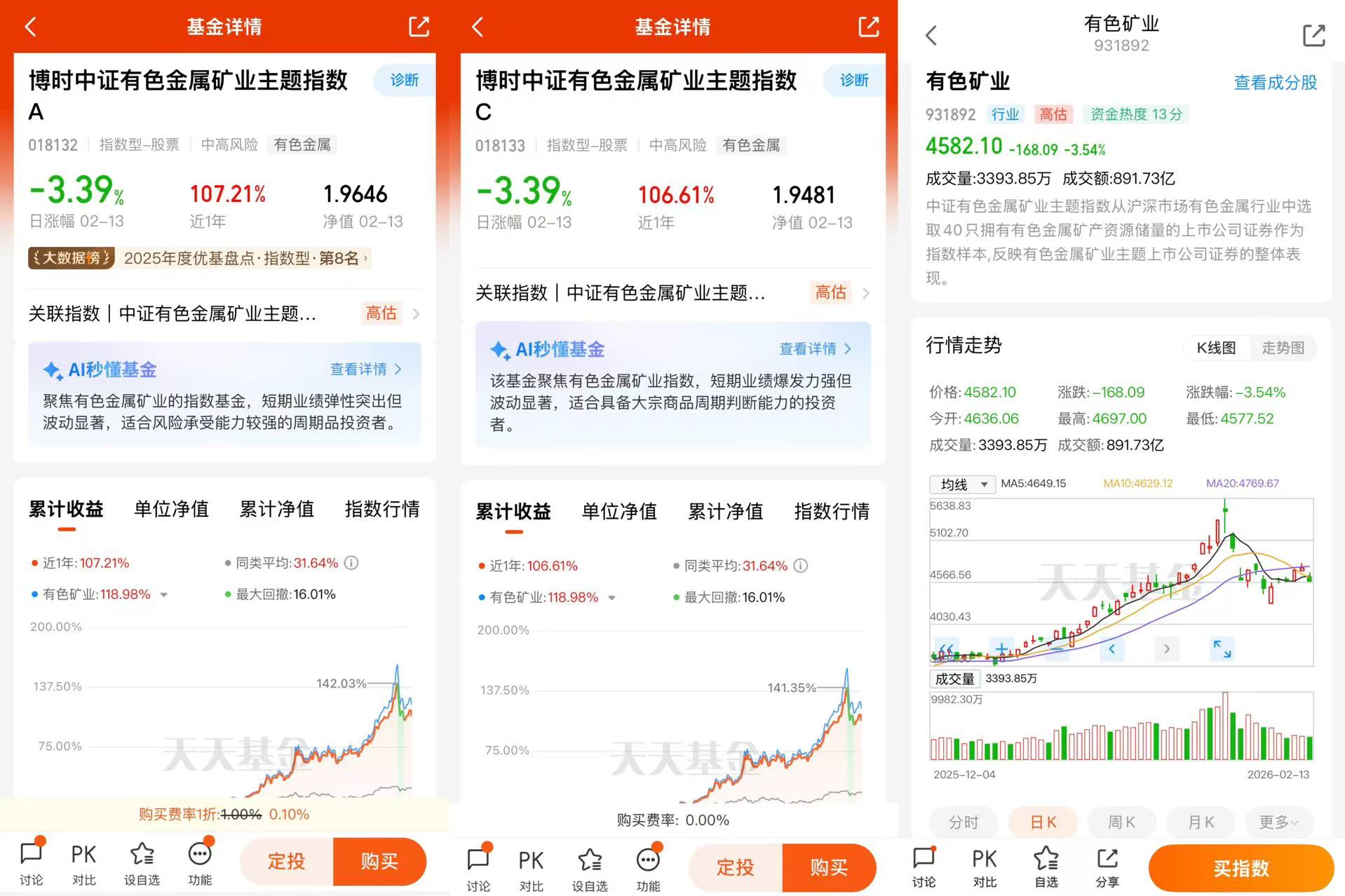 博时中证有色金属矿业主题指数A(018132)“近1年”阶段涨幅高达107.21%,远超过同类平均的31.64%和同期沪深300指数19.34%,取得大幅超额正收益,在3503只同类基金中排名高居第33位。