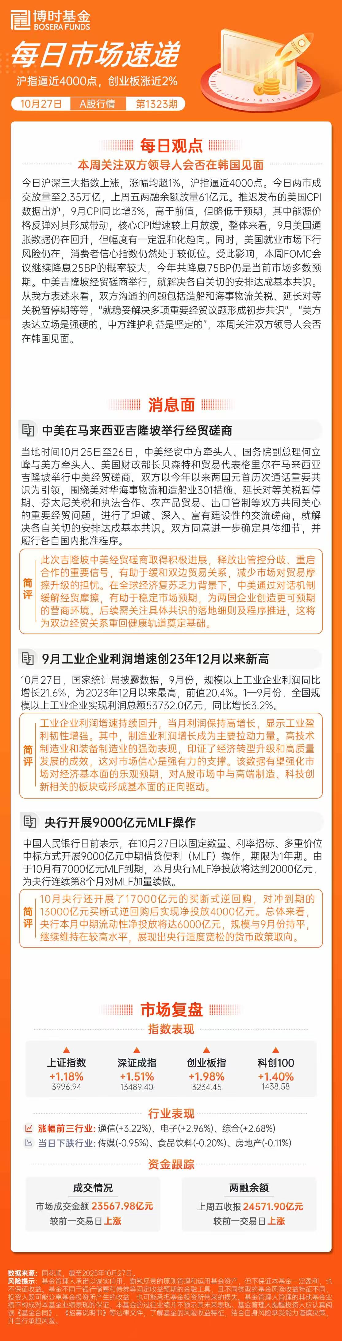 【博时市场点评10月27日】沪指逼近4000点,创业板涨近2%