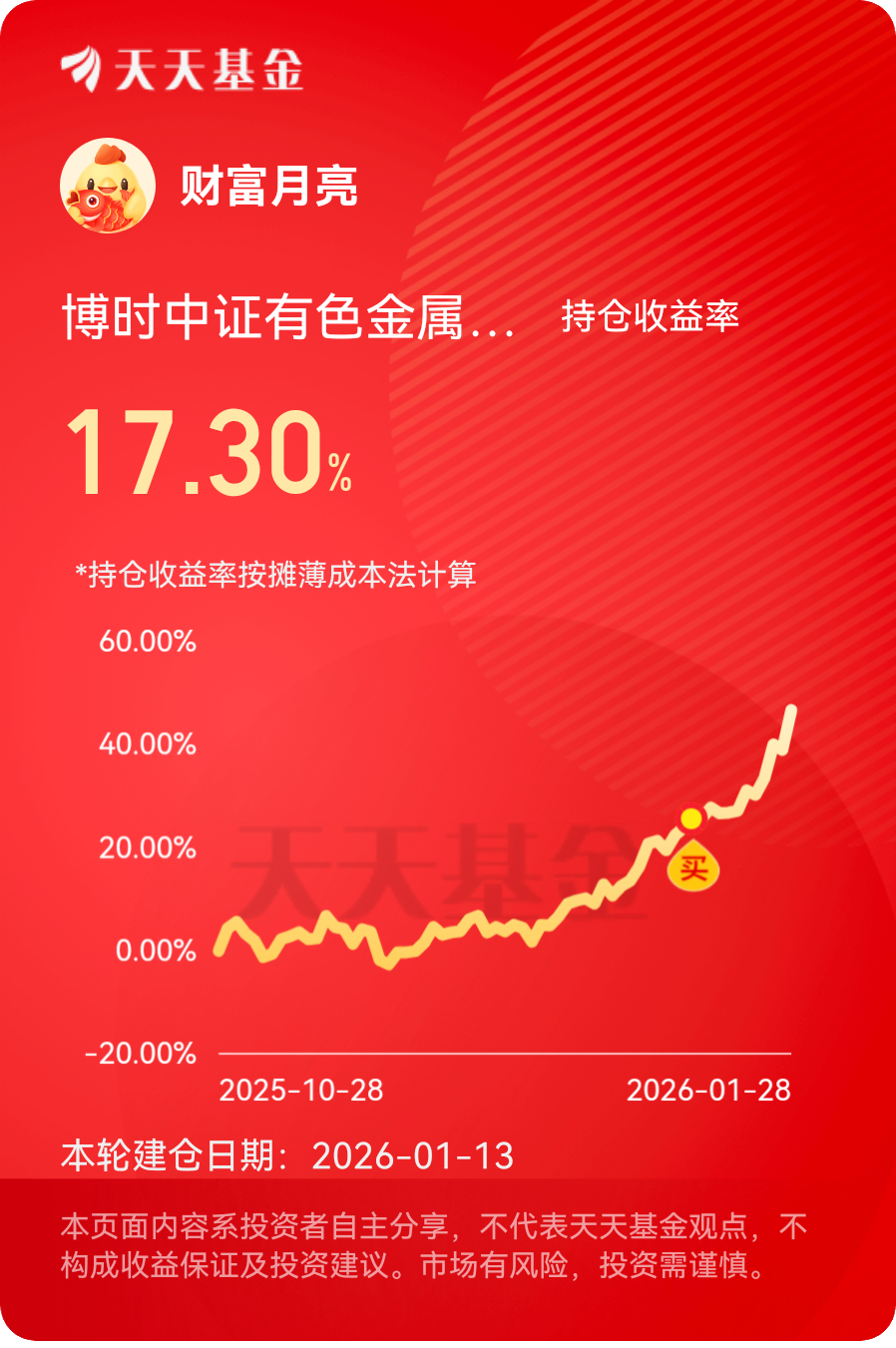 #煤飞色舞!资源机会来了?# 今天市场真是"煤飞色舞"啊!看到中国黄金4连板、中国海油创历史新高,资源股这波行情确实挺猛的。$博时中证有色金属矿业主题指数C$ 最近表现也不错,近一个月涨了30%左右,在同类产品里排名靠前。这基跟踪的有色金属矿业主题指数,主要投的是紫金矿业、洛阳钼业这些上游资源开采企业,正好契合这轮资源涨价的逻辑。现在国际金价突破5200美元,铜铝等工业金属也持续走强,加上政策层面上海刚发布了18项措施提升有色金属定价影响力,感觉上游资源企业的盈利弹性会更大。#晒收益#