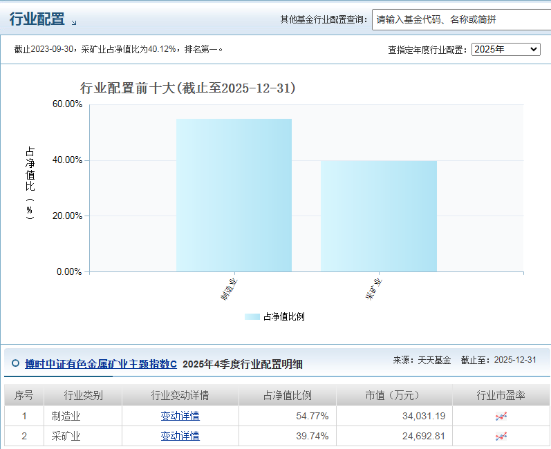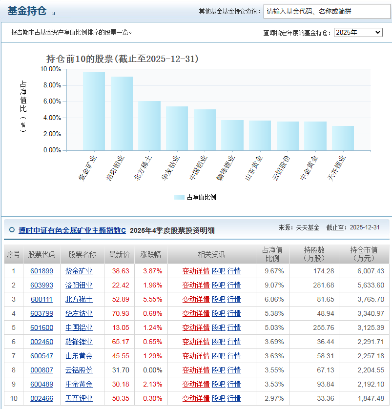 基金前十大重仓股均为国内有色矿业龙头,截至2026年2月最新数据,紫金矿业(9.67%)、洛阳钼业(9.07%)、北方稀土(6.06%)等龙头企业合计占比达51%以上,均具备丰富的矿产资源储备与成熟的开采技术,既能充分享受金属价格上涨带来的主营业务盈利提升,还能获得库存增值收益,收益弹性显著高于纯加工类有色企业。同时,基金股票资产投资比例不低于90%,其中80%以上投向标的指数成份股及备选成份股,近乎满仓聚焦矿业赛道,不做过多主动择时,精准跟踪矿业板块走势,避免赛道分散导致的收益稀释。