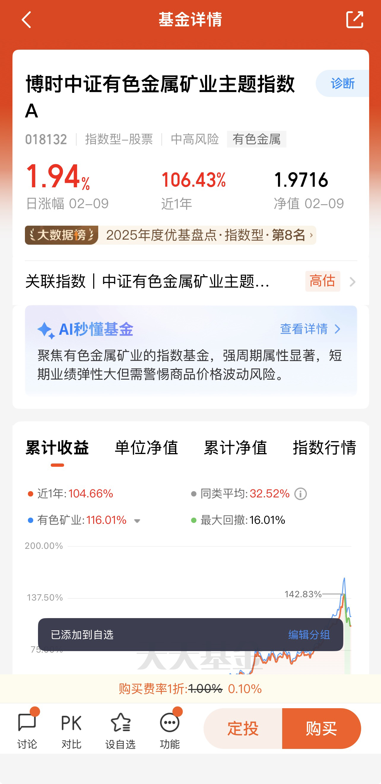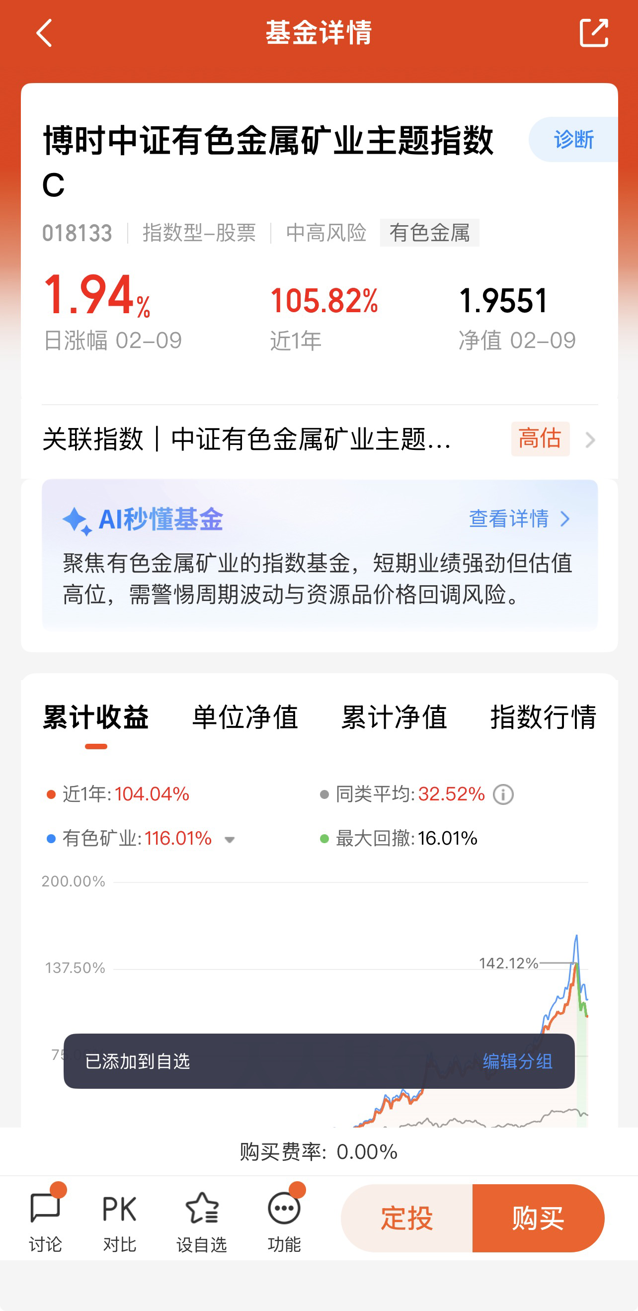 3. 小额投资者、想分散布局资产的投资者:基金最低1元起购,门槛极低,适合小额投资者逐步建仓、积累收益;同时,有色矿业板块与科技、消费等赛道相关性较低,适合已有核心持仓(如白酒、新能源基金)的投资者,配置该基金实现资产分散,降低组合整体风险。