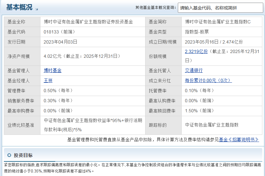 博时中证有色金属矿业主题指数C(018133)的核心竞争力的是“赛道纯粹、成本低廉、管理专业、弹性突出”,精准聚焦有色矿业龙头,完美适配2026年有色板块“矿业领涨”的行情特征,是普通投资者借道把握有色板块红利的优质工具。其上车逻辑源于2026年有色矿业板块“供需紧平衡+宏观政策共振+估值安全”的三重支撑,回调分批布局、长期持有或定投,是更稳妥的参与方式。