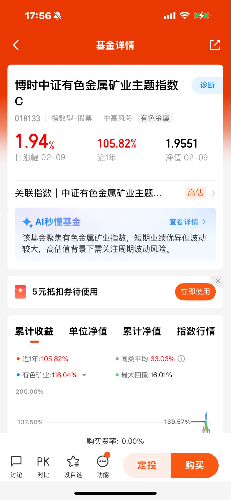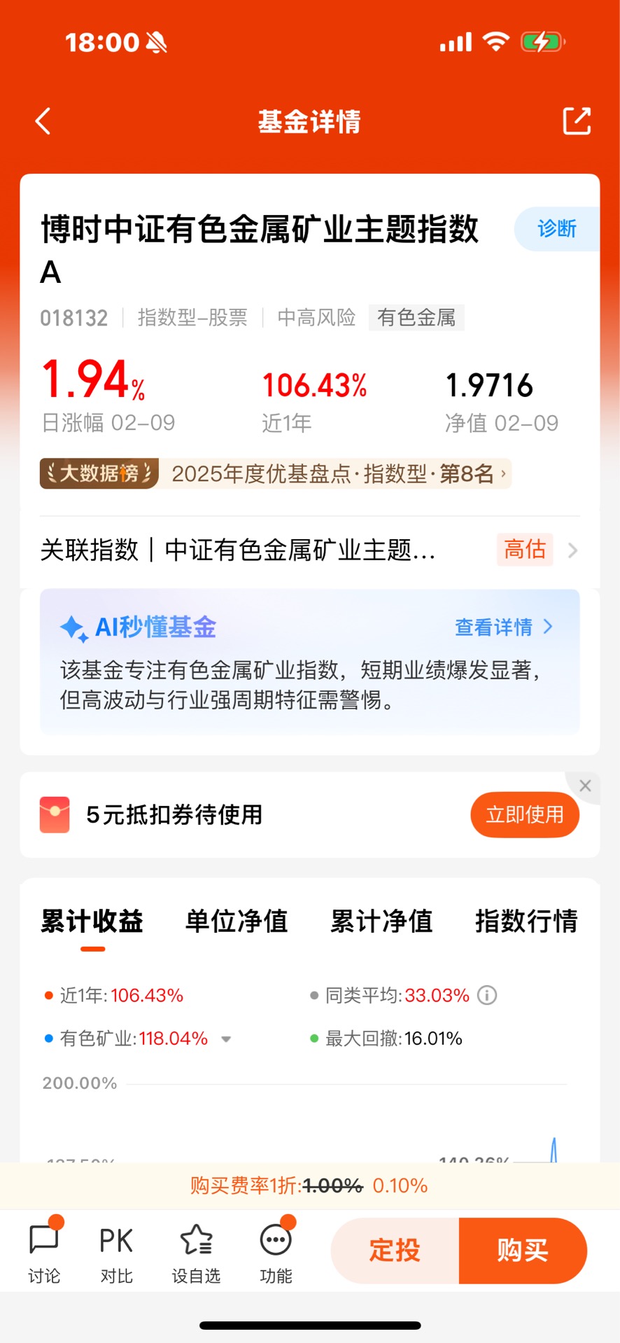 结语:有色金属的崛起,是全球能源转型与科技革命的必然结果,而博时中证有色金属矿业主题指数C(018133)则为普通投资者打开了通往这一核心赛道的大门。面对近期板块的冲高回落,我正密切关注这只聚焦矿业龙头的指数基金,计划采取定投的方式逐步布局,积攒份额,坚定看好2026有色金属的投资机会,我相信,在供需共振、政策护航、估值修复的多重利好下,这只基金不仅能充分享受行业周期红利,更能捕捉新兴产业带来的成长机遇。让我们一同把握时代红利,实现资产的稳健增值。@博时基金