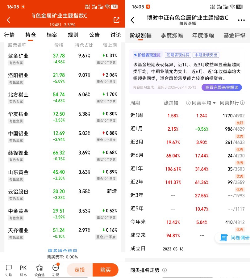 回头看博时中证有色金属矿业主题指数C,它跟踪的指数叫“有色金属矿业主题”,说白了,投的是上游有矿的企业。