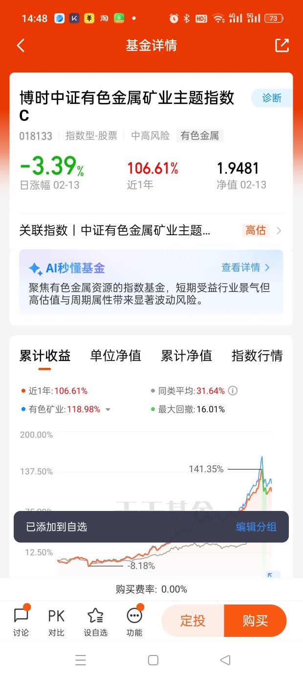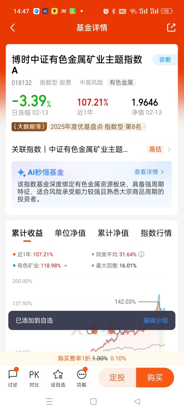 所以面对这种周期再起的苗头,我的做法很简单。不指望一把梭哈抄在最低点,而是把像博时中证有色金属矿业主题指数C这样的工具放进观察池,趁着市场情绪低迷、价格回调的时候,分批慢慢接一点。这个指数主要投向铜、铝、稀土这些工业金属领域的公司,和板块走势贴合度高,省去了挑个股踩雷的麻烦。2月份那一波深跌,事后看反而是机会。眼下宏观环境虽然复杂,但需求端有AI、电网、新能源车顶着,供给端矿山又没啥增量,这种基本面格局,值得拿住筹码跟时间做朋友。