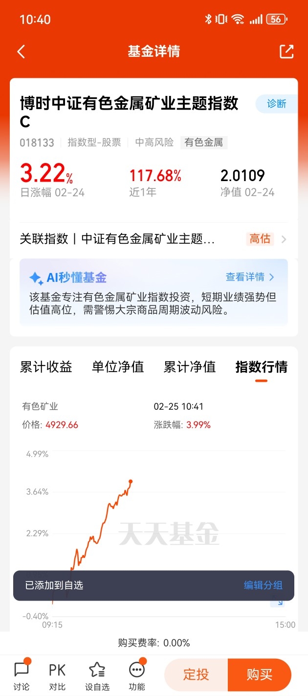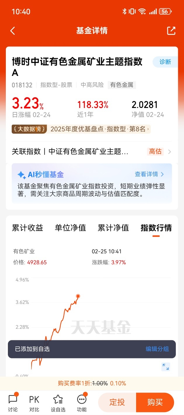 博时有色矿业指数基金的优势,在市场波动中愈发明显。作为指数基金,它不依赖基金经理主观判断,避免了风格漂移与决策失误,紧密跟踪指数,确保投资者获得行业平均收益。持仓以龙头企业为主,这些企业资源储量丰富、产业链完整、抗风险能力强,在市场调整时能够有效抵御波动,在行情回暖时快速反弹。同时,基金费率亲民,管理费率0.70%、托管费率0.1%,远低于同类主动基金,长期持有能有效降低成本,提升净收益。$博时中证有色金属矿业主题指数A$