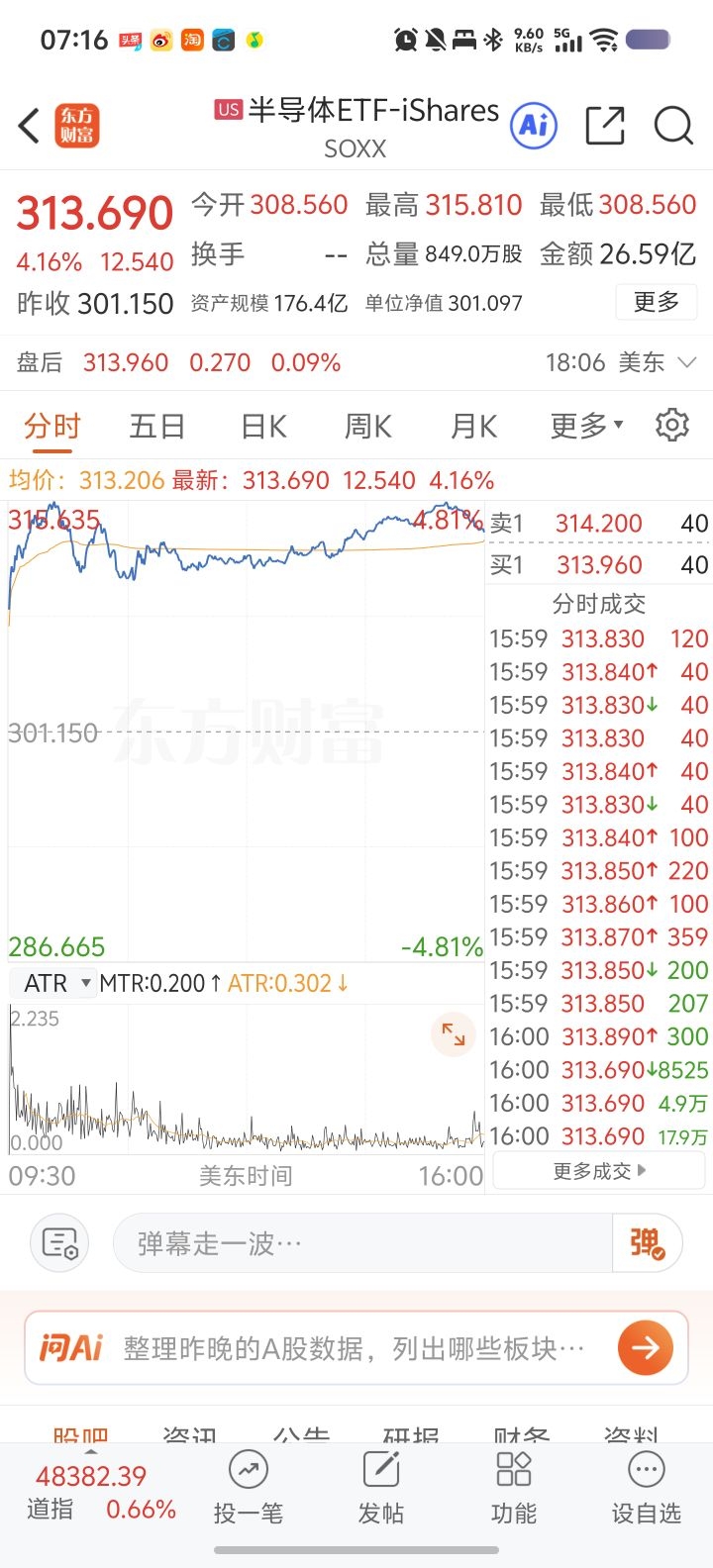 昨晚美股纳指100高开跳水,好在半导体板块强势,不然又白欢喜了,虽然你持仓涨不到4%,但总比下跌好