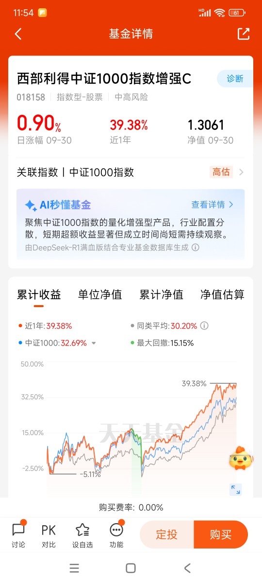 #主观量化还是被动指增#我选择被动指增。指数增强基金的核心优势可概括为"跟踪指数,但不满足于指数"。它通过量化模型在成分股基础上主动选股,力争获得超越基准的回报。2025年第一季度,沪深300指增基金平均收益达25.48%,显著高于普通沪深300指数基金的6.07%。这类产品融合了被动投资的低费率、高透明度与主动管理的收益增强,尤其适合震荡市:在2025年市场风格快速切换中,指增基金因系统化捕捉轮动机会,业绩稳定性突出,近八成产品连续跑赢基准。小盘股指增产品是我关注的重点,因为小盘股指数成分股更多元,量化模型选股空间更大,易产生阿尔法。中证1000指数代表A股后1000只小盘股,相关指增产品在2025年前5个月平均收益率12.24%,超额收益达10.95%。尽管当前部分小盘科技股估值高企,但降息周期中小盘股对流动性改善反应更敏锐,长期盈利修复空间可观。西部利得中证1000指数增强基金坚持80%以上非现金资产投资于成分股,同时在全市场选股增强收益,并运用股指期货等工具控制风险。基金经理盛丰衍自2016年管理量化产品,经验丰富,其管理的西部利得量化成长混合任职回报99.31%。该基金自2023年4月成立以来,虽经历调整,但近一年收益15.17%(截至2025年5月数据),超越同类平均,适合愿意承担波动的投资者。