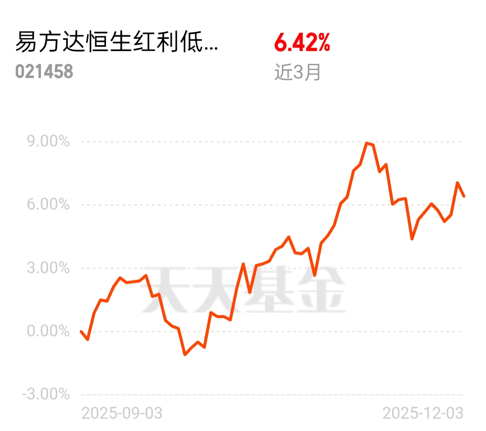 最近港股震荡调整,大家都在找稳当的资产,高股息低波动板块特别受欢迎。$易方达恒生红利低波ETF联接C$ 近 3 个月涨了 6.42%,防御属性拉满,适合不想冒太大风险的朋友。