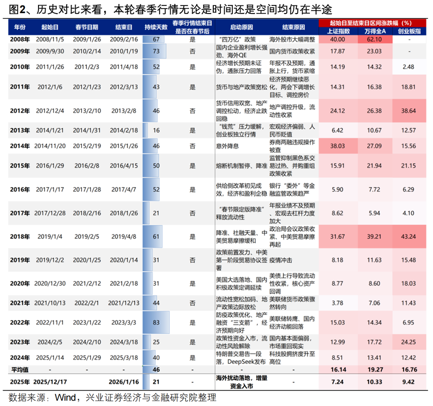 而2008年以来的历轮春季行情,平均持续时长可达46个交易日,且多数能延续至春节之后,三大指数平均涨幅分别为16.14%、19.27%、16.76%。
