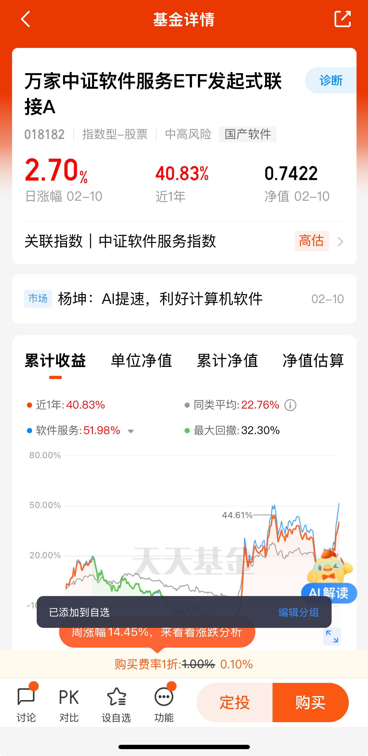 骑牛看熊比较看好万家中证软件服务ETF发起式联接C(018183),原因有7点: 1.明确的投资策略 该基金为目标ETF的联接基金,以目标ETF作为其主要投资标的,这种投资策略有助于投资人通过本基金间接投资于软件服务行业的一篮子股票,从而分散风险并享受行业增长带来的收益。同时,由于基金主要投资于目标ETF,因此其管理费用相对较低,有助于提升投资人的收益。 2.专业的管理团队 万家中证软件服务ETF发起式联接C由万家基金管理有限公司管理,该公司拥有丰富的资产管理经验和专业的投资团队。基金经理及团队具备深厚的行业知识和投资经验,能够准确把握市场动态和行业趋势,为基金的投资决策提供有力支持。 3.紧密跟踪指数 该基金的投资目标是紧密跟踪中证软件服务指数的表现。中证软件服务指数涵盖了软件服务行业的优秀公司,具有较高的代表性和成长性。通过紧密跟踪该指数,基金能够较好地捕捉行业增长机会,为投资人带来稳定的回报。 4.灵活的交易方式 作为ETF联接基金,万家中证软件服务ETF发起式联接C在交易上具有较大的灵活性。投资人可以在交易日内随时买卖基金份额,且交易费用相对较低。这种灵活的交易方式有助于投资人根据市场情况及时调整投资策略,实现资产的优化配置。 5.潜在的增长空间 随着数字化和信息化时代的到来,软件服务行业迎来了前所未有的发展机遇。行业内的公司不断创新和拓展业务,推动了行业的快速增长。作为投资于该行业的基金,万家中证软件服务ETF发起式联接C有望受益于行业的增长趋势,为投资人带来长期的投资回报。 6.基金规模 截至2024年12月31日,期末净资产0.30亿元,比上期增加174.05%。基金规模的增长可能反映了市场对其的认可度在提高。规模的增长在一定程度上有利于投资策略的稳定实施,并且在流动性方面也会有更好的表现,例如在大额赎回或申购时,规模较大能更好应对资金进出对基金净值的影响。从历史来看,2023年3月成立时规模为0.08亿元,规模逐步增长。 7.基金应对措施 基金管理人可能会通过调整投资组合的结构、控制赎回规模等方式来应对。同时,基金规模的增长也有助于在一定程度上增强应对流动性风险的能力。 万家中证软件服务ETF发起式联接C(018183)通过其多样化的投资组合、高度集中的目标ETF投资策略、灵活的投资策略以及长期投资潜力,为投资者提供了一个具有吸引力的投资选择。然而,投资者在选择投资该基金时,仍需考虑自身的风险承受能力和投资目标,并密切关注市场动态和基金的表现。