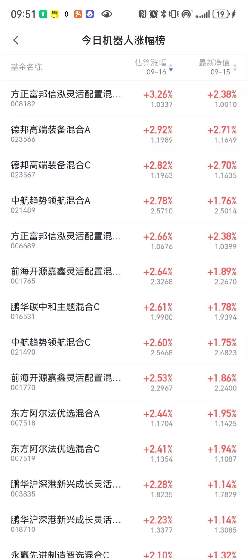 机器人板块今天又发力了!指数涨超2%,汉威、景兴涨停,北特、卧龙、中大纷纷上涨。机构资金大举进场,净流入近7亿,政策+产业双轮驱动,蚂蚁、优必选、美的全在加码,AI+机器人不再是未来,是现在!$方正富邦信泓混合A$ 涨了3%左右,还不错哦$嘉实制造升级股票发起式C$ 估值调证了-0.02%,加油冲啊