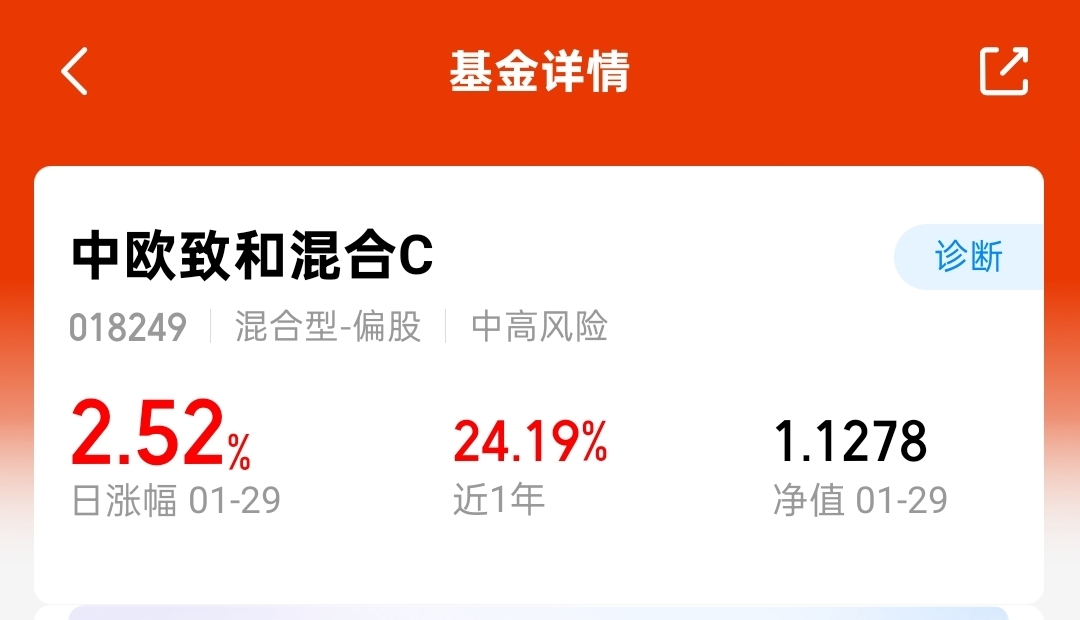 中欧致和混合C,涨2.52%,逆势上涨不错呀,近一年涨幅近25%,主要持仓科技互