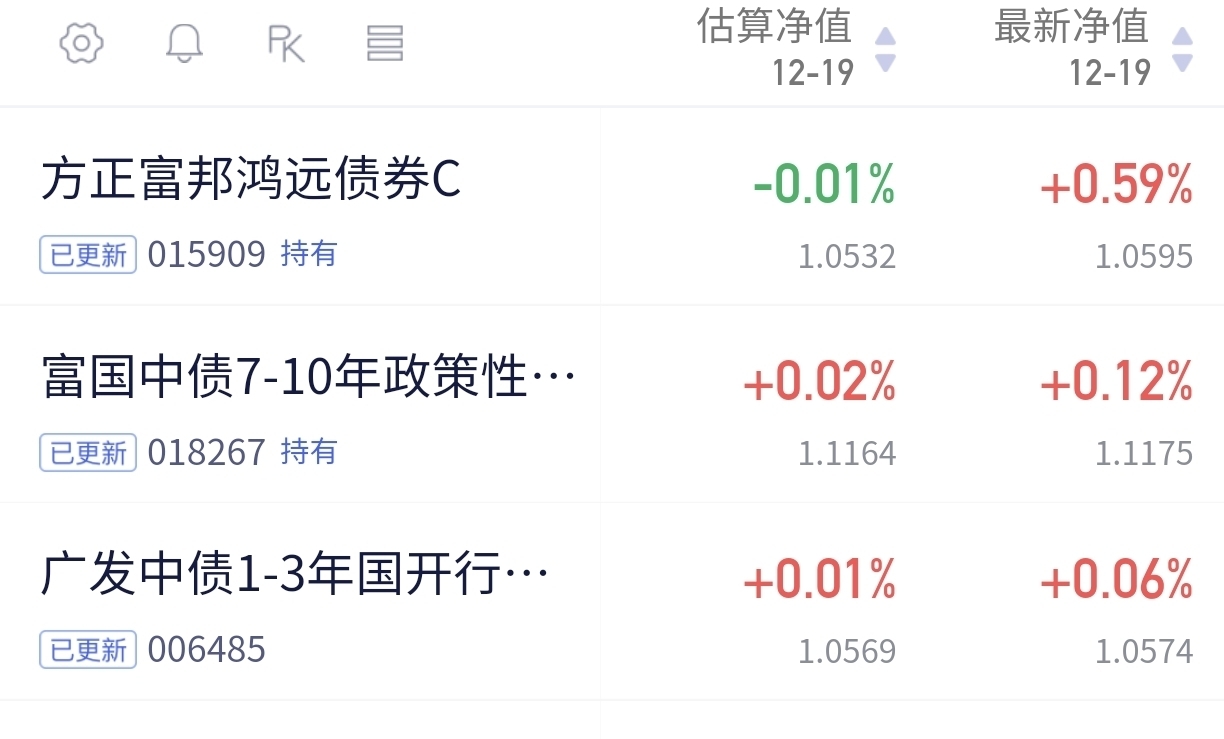 今天债市温和上涨,配置盘进场明显。$方正富邦鸿远债券C$ 收了59个蛋,其余基也有零星蛋入袋。虽然弹性有差别,但大家都在回血,账户不再天天绿,心情也轻松些了。