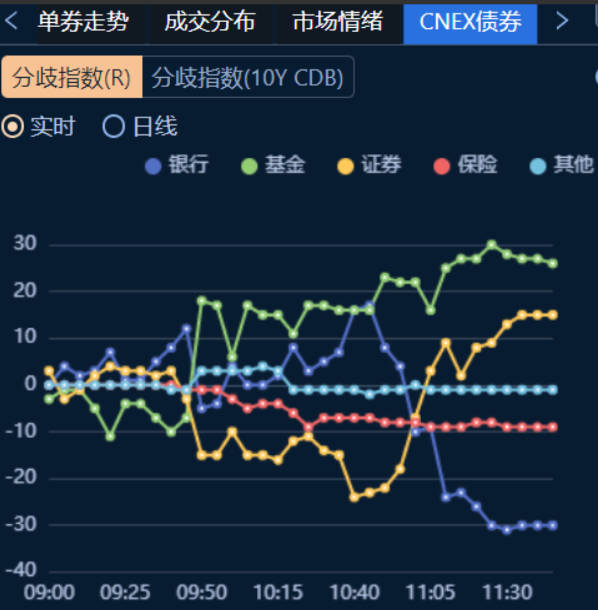 债券分歧指数显示:早盘基金积极买入,券商盘中一度维持卖出,近午间转为买入,并同步买入10Y国开债。