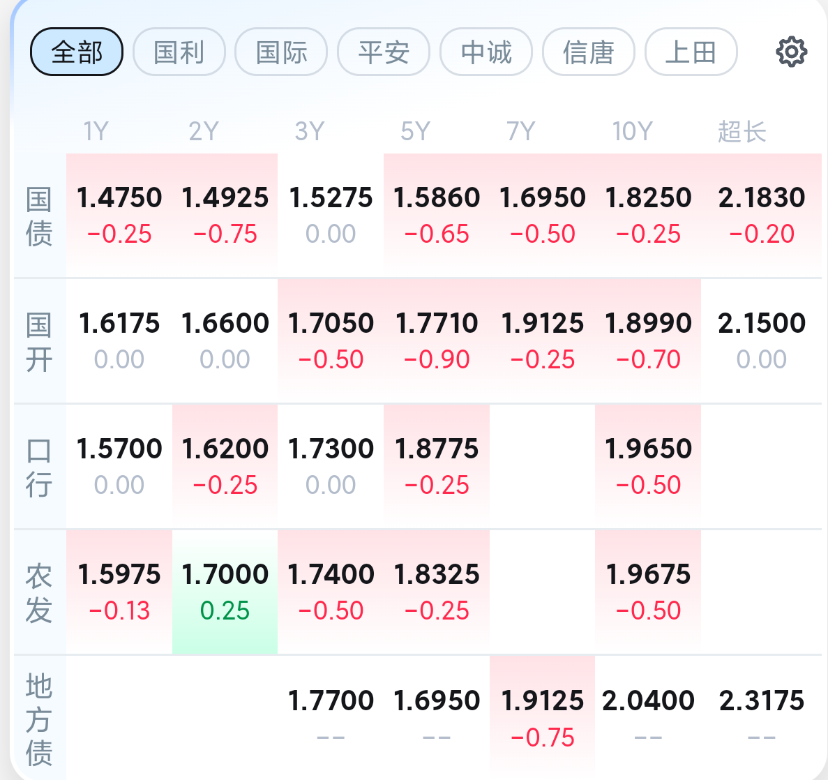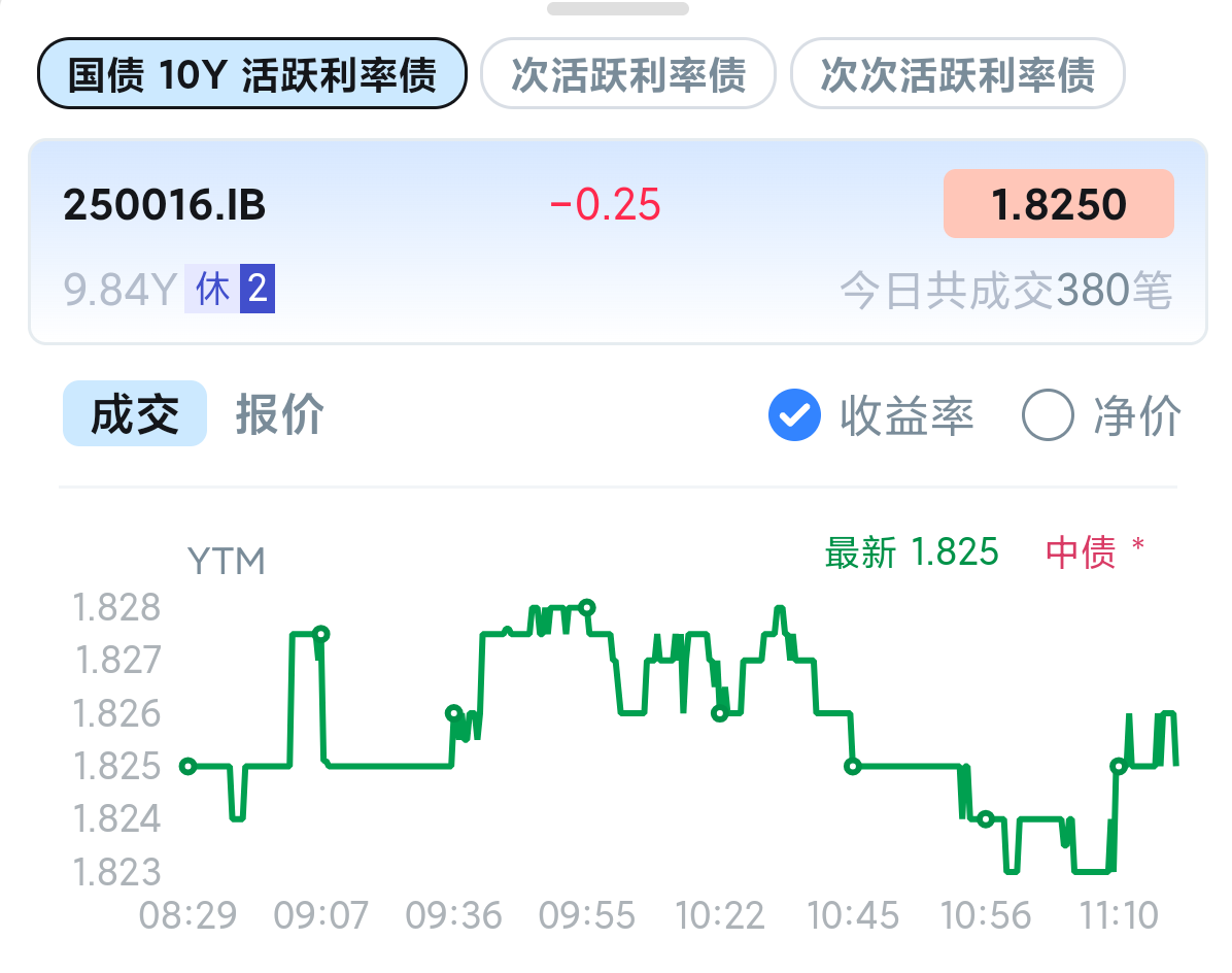 十年期国债收益率:1.825%,-0.25BP(国债收益率越跌,债市越涨)