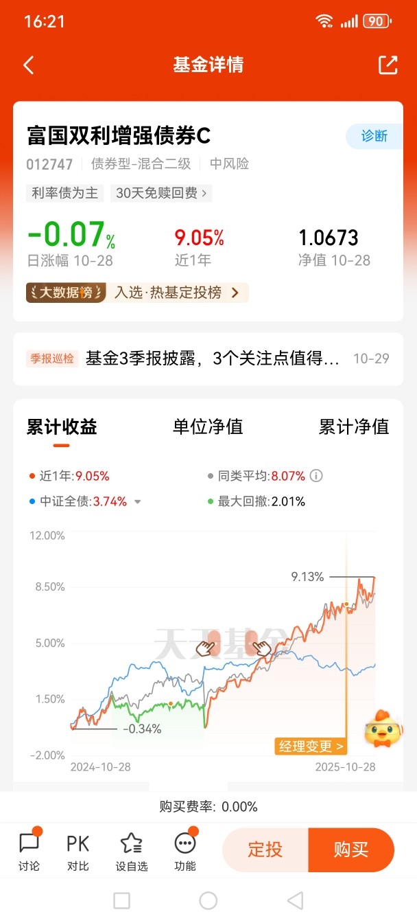 最近加仓了富国双利增强C,基金经理宏观择时真有一手三季报重仓有色、非银这些周期板块,踩点挺准。近1个月涨了1.8%,近半年近7%,跑赢大多数同类,周周赚钱概率超69%,拿住心里不慌!