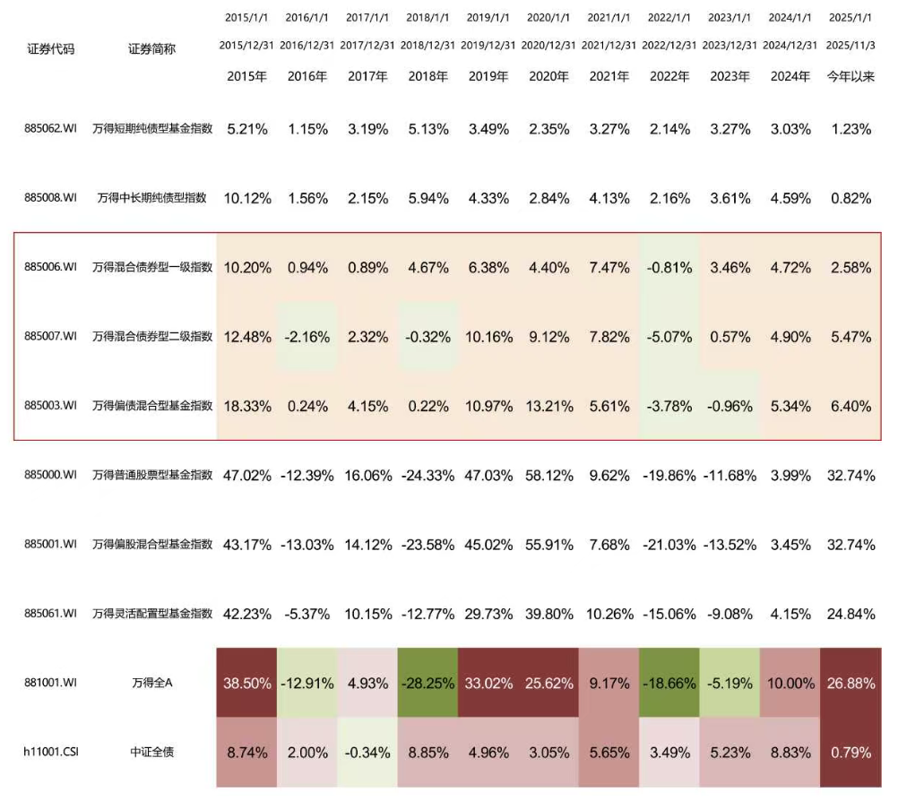 如2015年,Wind全A指数年度上涨38.50%,中证全债指数年度上涨8.74%,形成股债双牛格局。偏债混合型基金指数年度收益超18%,混合债券型一级指数、混合债券型二级指数年度收益均超10%,均优于两只纯债型基金指数表现(短期纯债型基金指数涨幅5.21%、中长期纯债型基金指数涨幅10.12%)。