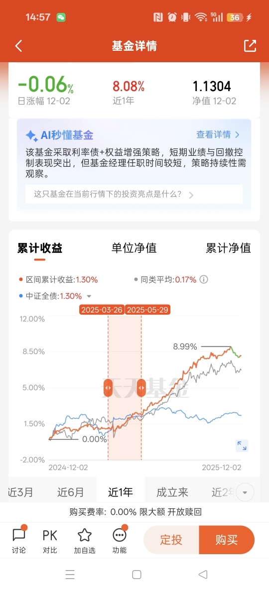 市场调整我直接加了点。最近市场热点在AI、自主可控这些科技方向,这基权益仓有涉及,跟得上节奏。