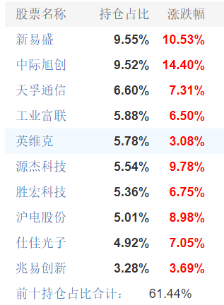 前10重仓股集中度61.44%,龙头效应突出,有行情时爆发力超强,昨天大6.24%,全市场排名第5,是CPO标的中弹性相当高的单品,预计今天也要超过6个点。