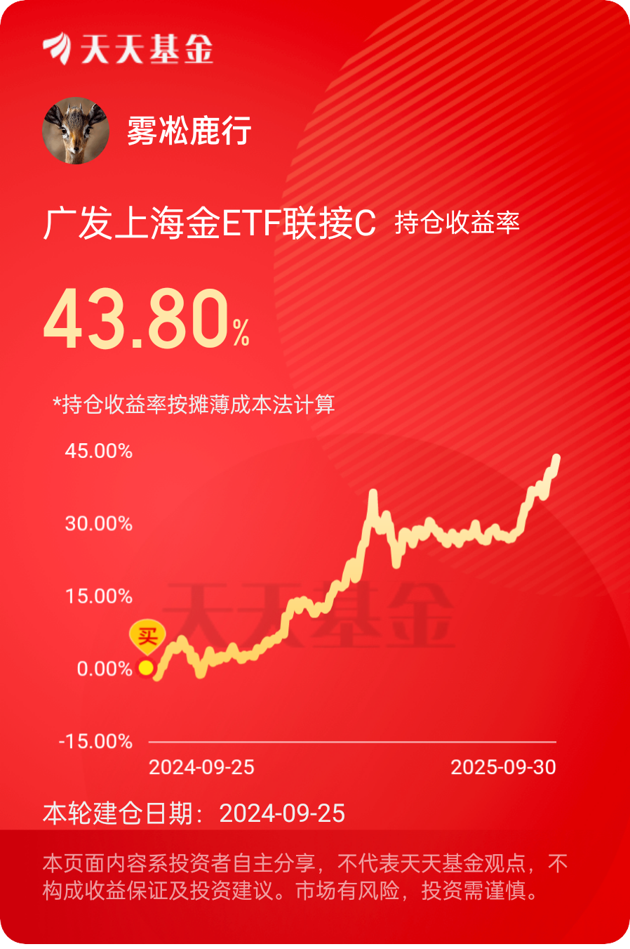 站在三季度末的时间节点,结合持仓经验与市场研判,我对四季度黄金行情充满期待,也计划继续持有并优化广发上海金ETF联接C的配置策略。