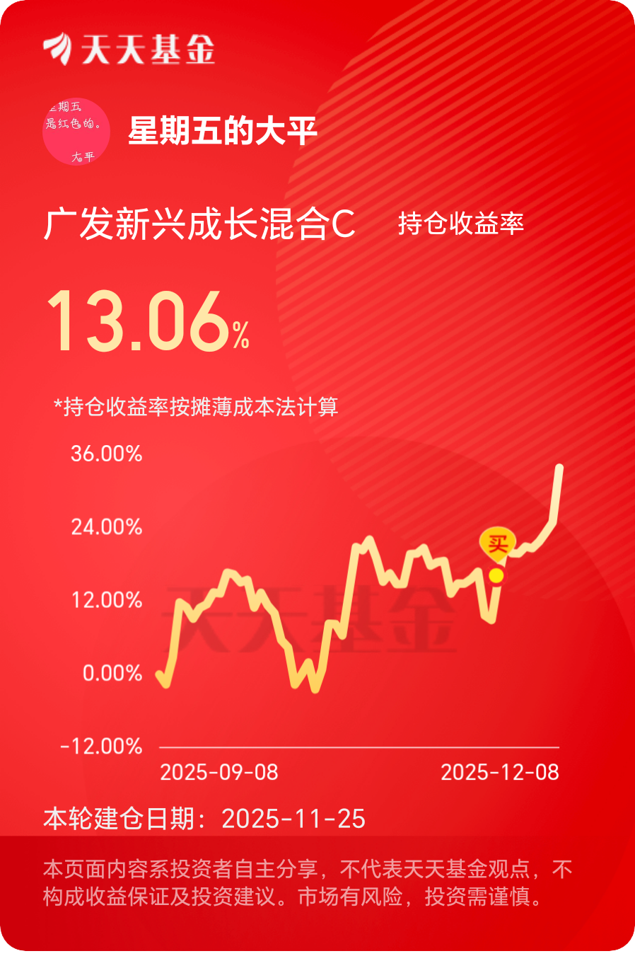 #券商行业迎利好:杠杆上限“松绑”# #摩尔线程开盘价650元!一签赚超26.7万# #12月基金投资策略# #心仪的超额收益基# #低估补涨号启航# $广发创新成长混合C$ $广发新动力混合C$ $广发港股通科技ETF联接C$ $广发中证光伏产业指数C$ $广发上海金ETF联接C$ $广发价值领先混合C$ $广发碳中和主题混合发起式C$ $广发国证新能源车电池ETF联接C$