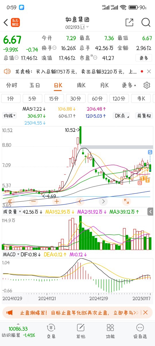 如意突然变盘下杀,这种突如其来的变盘,我也没全躲过,但由于低位布局,并且做了几个t,再加条件单触发破位清仓避险,虽不至于被套,但约等于白玩(股票变盘快,风险高,这就是低位布局和设置变盘破位止损的重要性了)。润邦躲过了,如意没躲过,有点狠呢。
