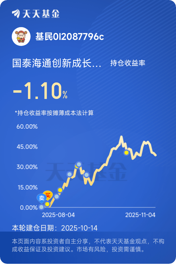 而选择一直拿着国泰海通创新成长混合发起C,是我持仓的日子里,慢慢“试”出来的放心。最开始买它,是看中它不追热点、只扎科技成长赛道的专注——既没跑去碰短期炒得火的周期股,也没在消费板块里分散精力,始终盯着AI算力、智能制造这些硬核方向。印象特别深的是二季度市场震荡时,它没有跟着大跌,后来才知道基金经理在选个股时,不仅看企业的技术实力,还会抠估值,不会盲目追高。这种“稳扎稳打”的风格,比那些涨得快跌得更快的基金,更让我觉得踏实。
