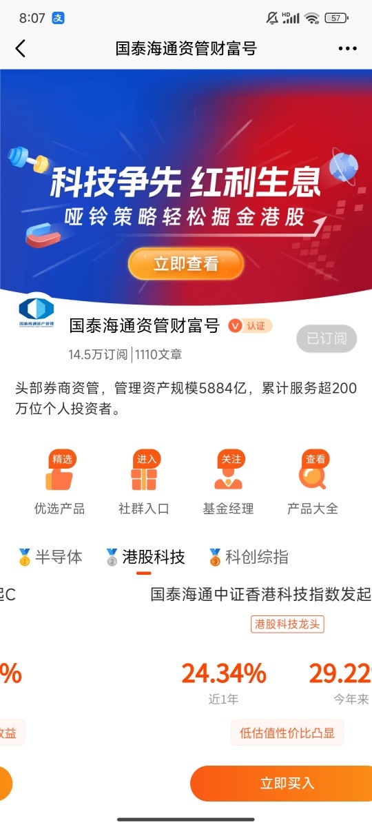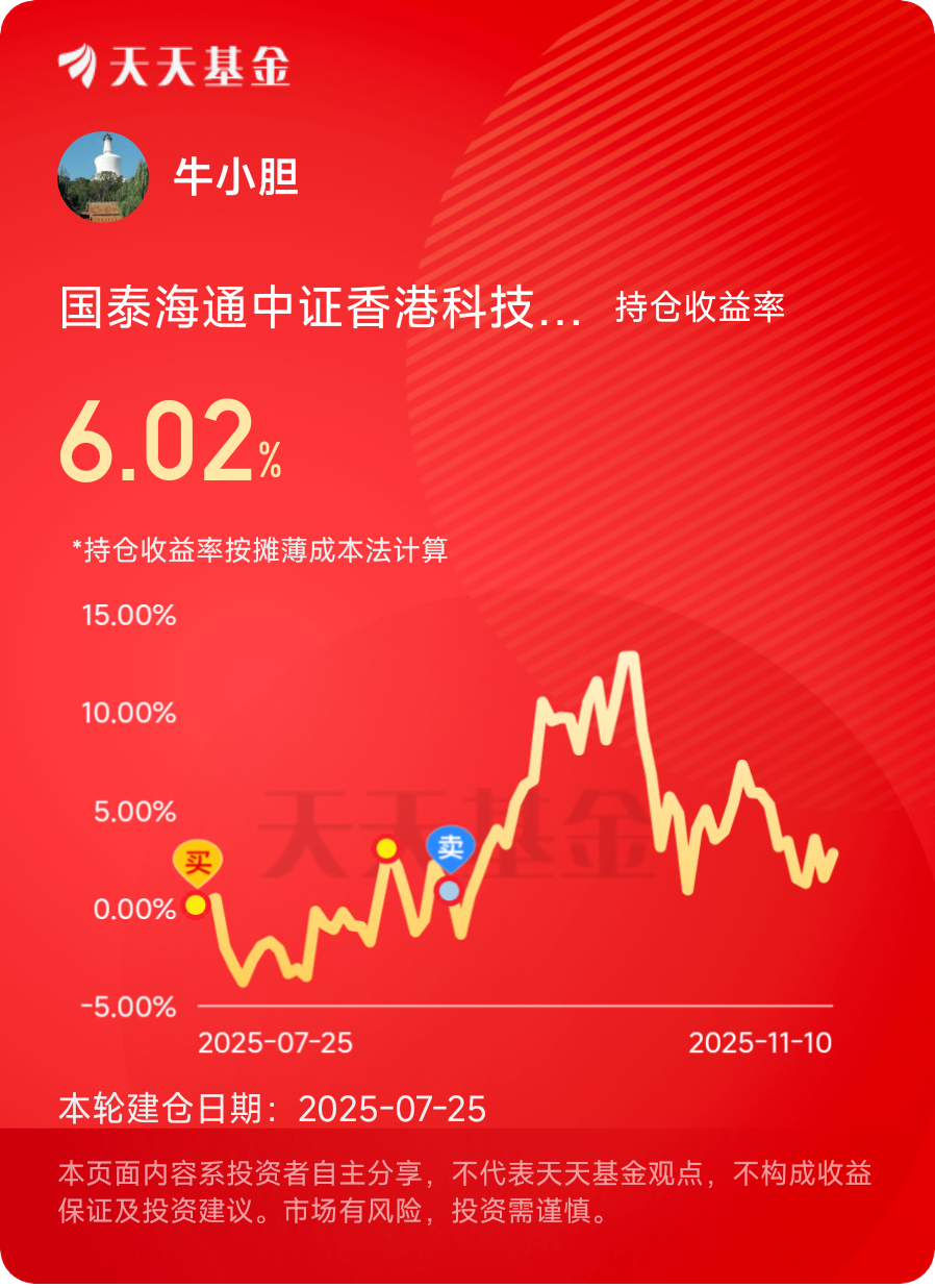 今年以来,A股市场波诡云谲,但科技赛道始终是我坚定看好的方向。从年初布局国泰海通创新成长混合(代码018326),到关注国泰海通中证香港科技指数发起式C,再到最终将国泰海通创新成长混合发起C(代码018327)纳入“长期持有清单”并设置每周1000元的定投,每一步操作都源于我对科技产业趋势的判断,以及对这只基金核心价值的认可。在不少人还在纠结“科技能不能投”时,我早已用实际行动押注——因为真正的好赛道+优质基金,值得用时间去等待回报。