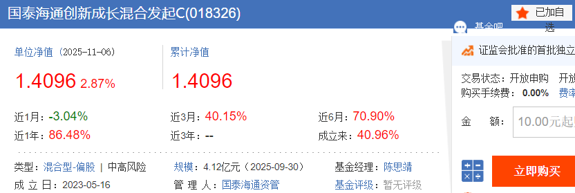 从历史业绩来看,国泰海通创新成长 018326 展现出较强的收益获取能力。截至 2025 年 10 月 31 日,基金成立以来收益率达 156.3%,年化收益率 42.1%;近一年收益率 97.01%,在 326 只同类科技主题基金中排名第 12 位;近三个月回报 44.16%,跑赢中证电子指数 21.3 个百分点,跑赢同类基金平均水平 18.7 个百分点。这种业绩表现与半导体 AI 行业的爆发期形成精准契合,体现了基金经理对行业机会的把握能力。