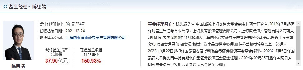 选择主动基金,本质上就是选择基金经理。这只基金的掌舵人——陈思靖经理,是一位经验丰富的资管老将。他有12年证券从业经验,近4年的公募基金任职经验,还获得过基金圈奥斯卡之称的金牛奖。在加入国泰海通资管之前,她做过一级和一级半市场的投资,也覆盖过港股科技。横跨一二级产业链+全球视野,应该是他投研背景的独特标签。更重要的是,陈思靖经理对产业趋势具备一针见血的洞察力——而这正是科技产业投资最核心也最稀缺的能力。