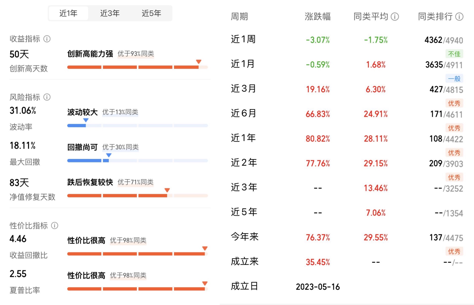 有了好的投资策略,落实到业绩表现上自然而然也是非常亮眼!自2024年9月25号陈思靖经理开始接手管理国泰海通创新成长混合基金以来,其任职期间回报率高达137.05%,也就14个月左右的时间,就已轻轻松松做到了翻倍收益率,不得不拜服。其次,其收益增长的方式非常优秀,收益性与扛波动性兼具。截至2025年11月19日,其近一年创新高的天数居于同类前10%,而同期最大回撤仅为-18.11%(对于一只成长风格的基金而言,这个回撤属于较小)。这种“能攻善守”的特性,使其业绩排名持续居前,而这也正是我所追求的科技主题基金。