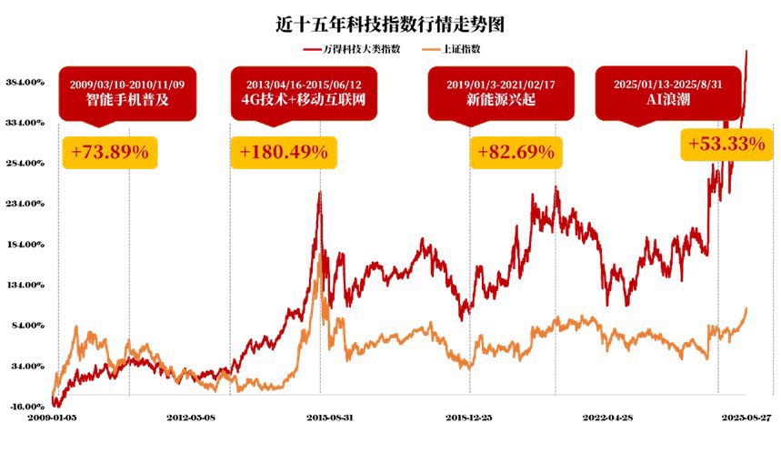 读史可以明智。复盘A股过去十几年的资本历程,“新科技”的身影始终贯穿其中,是当之无愧的投资故事主角。第一轮是2009-2010年的智能手机浪潮,万得科技大类指数最高涨幅达73.89%。苹果产业链在A股迎来爆发,国产手机也开始崭露头角。可惜好景不长,行业很快陷入价格战泥潭,行情最终以估值大幅回落告终。第二轮则是2013-2015年的移动互联网狂飙,万得科技大类指数最高上涨180.49%。2013年末4G技术在国内大规模推广,智能手机销量激增,移动支付、社交、游戏等各种应用深度融入生活,将科技股行情推向了极致。第三轮是2019-2021年的新能源全面崛起,万得科技大类指数阶段涨幅达82.69%。在“双碳”目标和政策强力推动下,新能源汽车产业链迎来高速增长期。
