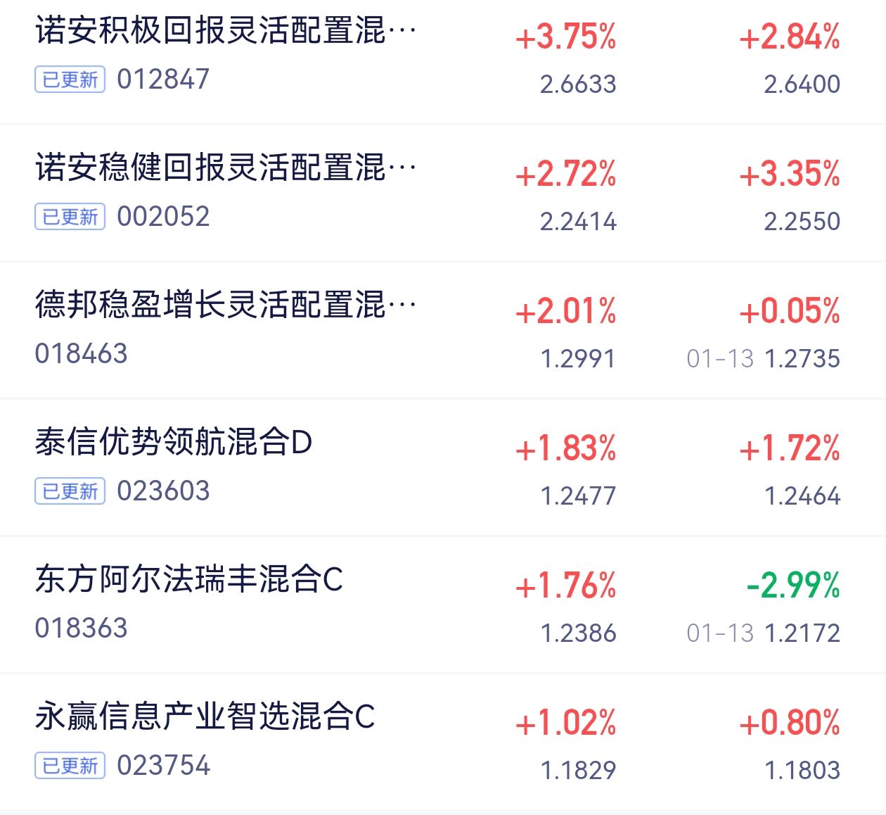 前阵子拿的那只基直接拉了坨大的,上周亏了快5个点,晚上刷论坛看到有人问“拉胯了要不要去诺安”,我犹豫了半天转了2万到积极回报C。今天开盘盯着净值,从2.65慢慢爬到2.6633,涨了2.84%,直接回了快3个点的血,把净值截图存相册里,总算不用盯着绿盘叹气了。#AI应用元年开启!概念股持续走强#
