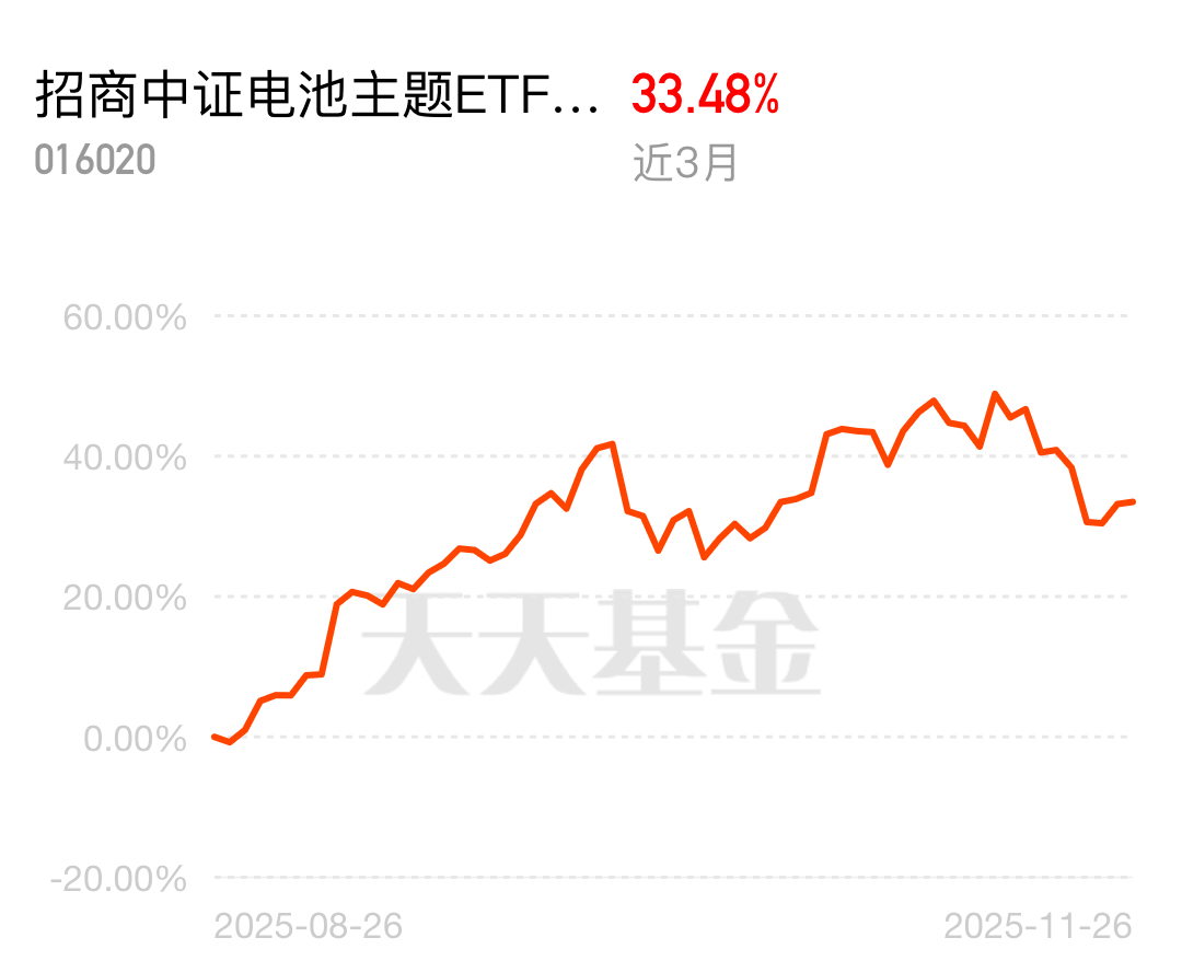 现在新能源行业发展势头正猛,锂电池作为关键零部件,需求端一直很坚挺,行业景气度持续高位。招商中证电池主题ETF联接C近3个月涨了33.48%,场外投资不用股票账户,轻松上车不费劲。$招商中证电池主题ETF联接C$