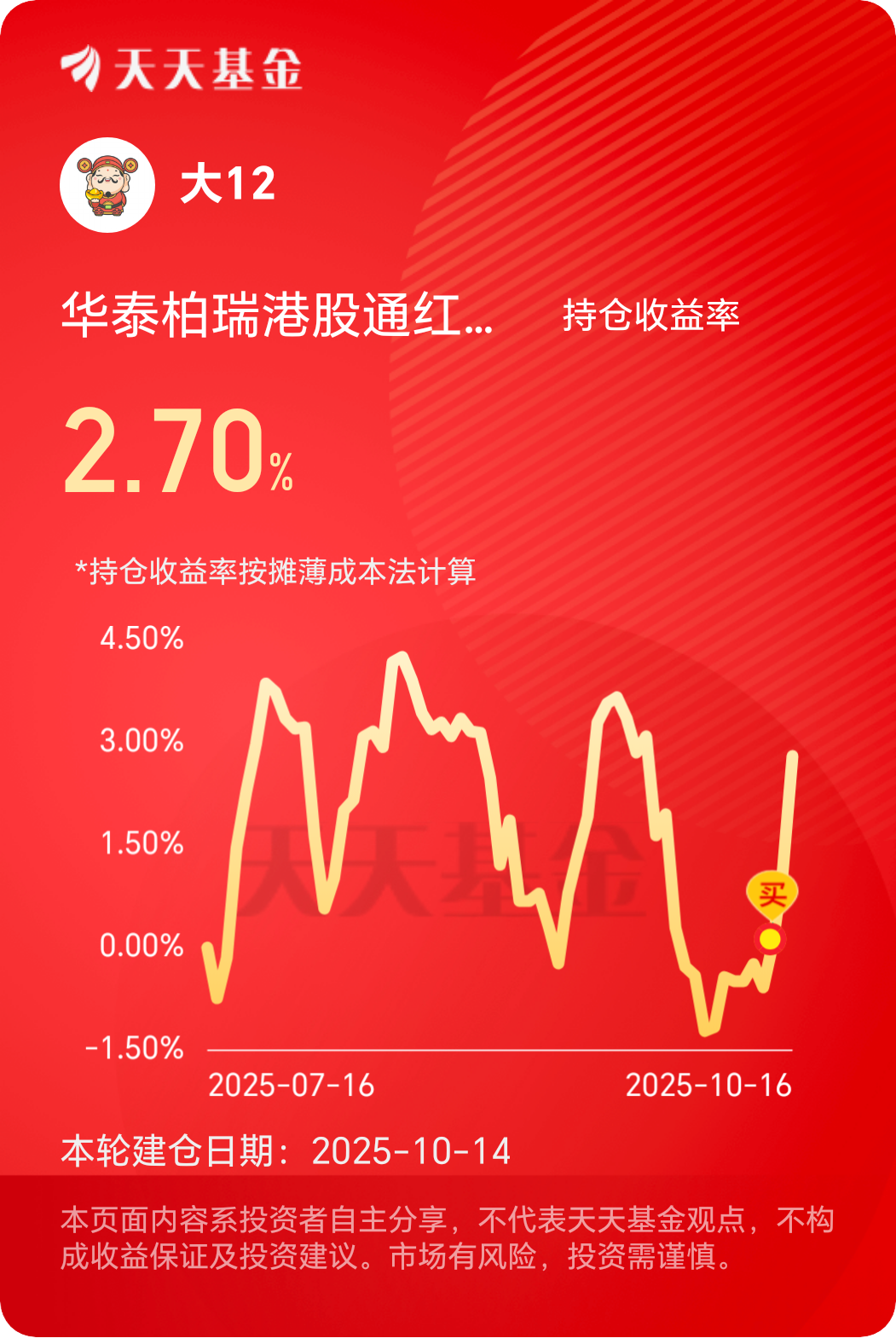 #晒收益# $华泰柏瑞港股通红利ETF联接基金C$ 今日收涨1.67%,顺利连涨三天。这波走势提示我们,在追求收益的同时,更应重视资产的安全边际和现金流。