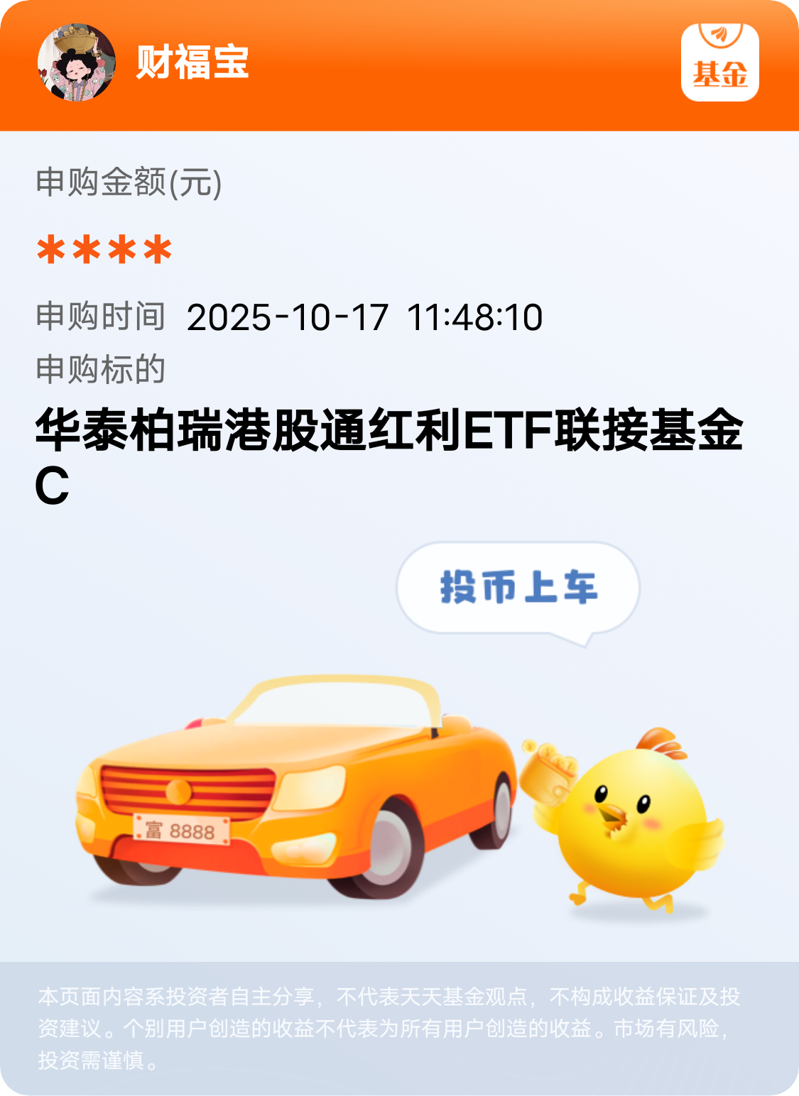 四季度传统上红利和消费表现不错,$华泰柏瑞港股通红利ETF联接基金C$ 已经连涨3天,今天回调机会难得。