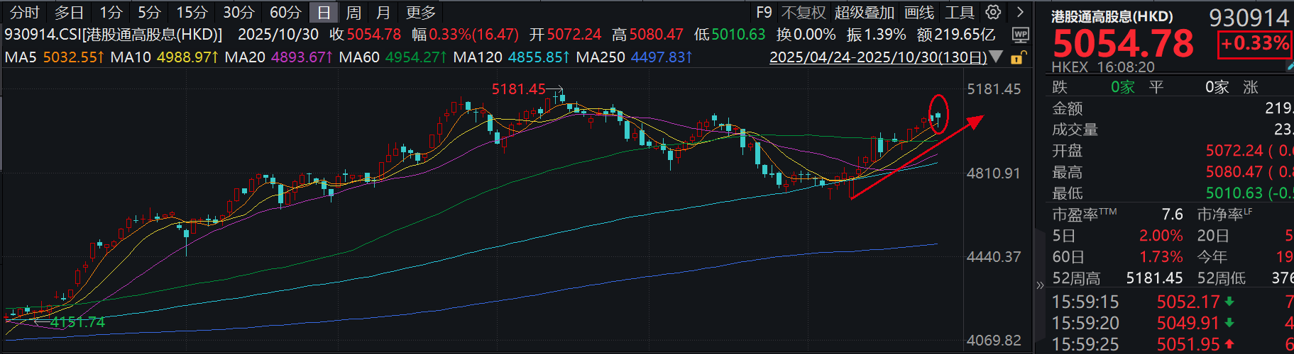 1)盘面上,今天港股通高股息指数表现强势,全天探底回升收涨0.33%,近期上行趋势明显。