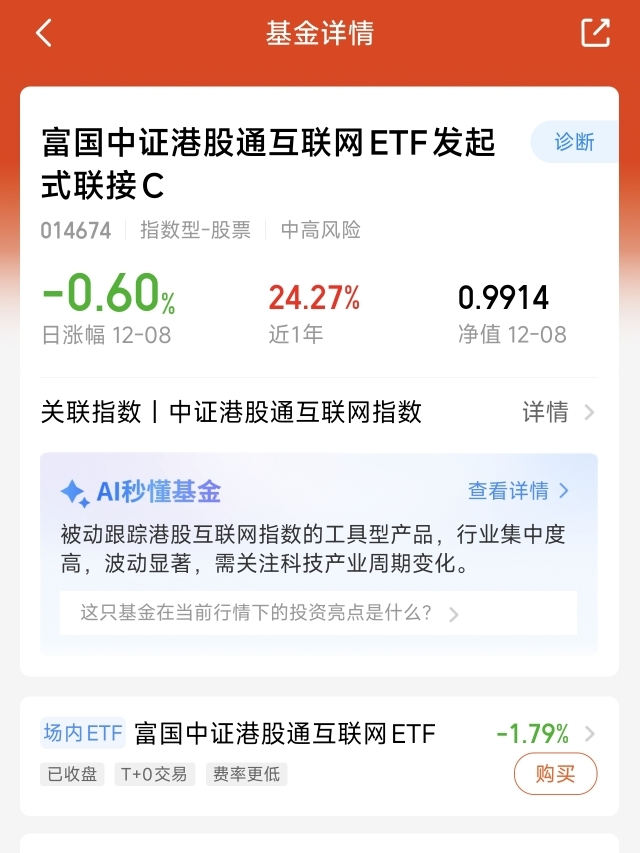 手里华泰那只港股高股息这段时间一个月一直绿,转头看了看富国中证港股通互联网ETF联接C,连涨3日,盘子有106亿,跟踪的电商、游戏这些主线政策暖风频吹,估值也低,今天加了点。