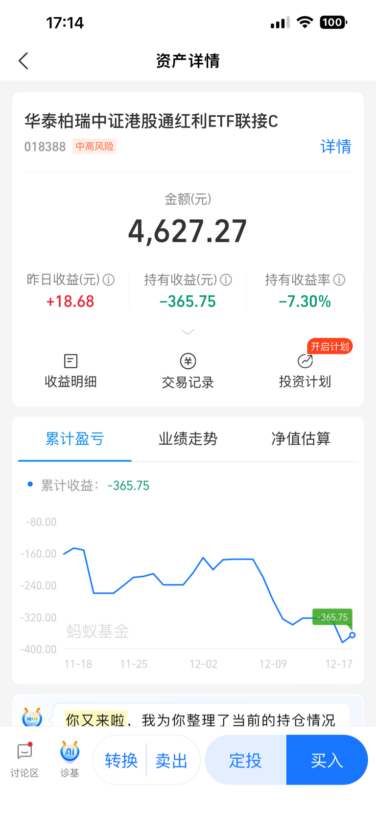 $华泰柏瑞港股通红利ETF联接基金C(OTCFUND|018388)$ 一样,支付宝推荐的可不能买