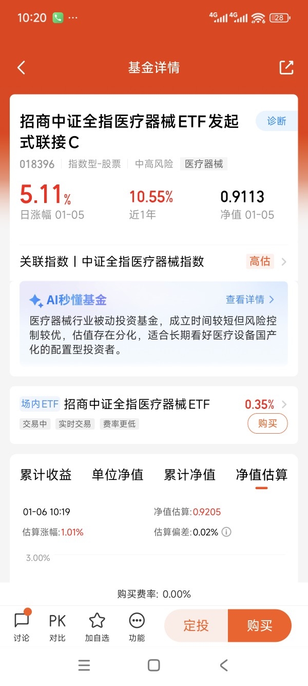 $招商中证全指医疗器械ETF发起式联接C$ 昨天上涨了5.11%。紧跟中证全指医疗器械指数。盘中最高涨超了6个点。全面覆盖了医疗器械的产业链。所以脑机接口的火热,目前已经进入新的上涨行情。同类基金业绩,昨天也是做到了优秀。我看好基金的稳定收益表现。
