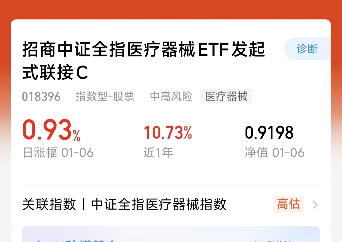 $招商中证全指医疗器械ETF发起式联接C$ 这是聚焦医疗器械的指数基金,紧跟中证全指医疗器械指数,昨天上涨了0.93%,前天大涨了超5个点,爆发力的表现强。今天的估值依然做到了稳定上涨。脑机接口也是属于医疗器械,所以指数今年的成长空间大。我看好基金的稳定收益表现。