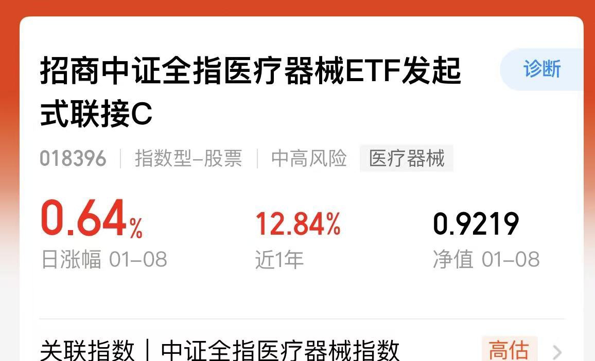 今年虽然说主线在科技,但是医疗方向也不错,医疗已经连涨多天了,市场交易情绪还是非常火热的,特别是脑机接口正在热点中,这个医疗与科技不相同,科技已经相对来说是在高位了,医疗方向还是在低谷,上涨的空间相对来说也会更充分一点。$招商中证全指医疗器械ETF发起式联接C$ 昨天单日涨幅达到0.64%,今年已经有12.84%的涨幅了,这个后面的行情还是值得期待的。