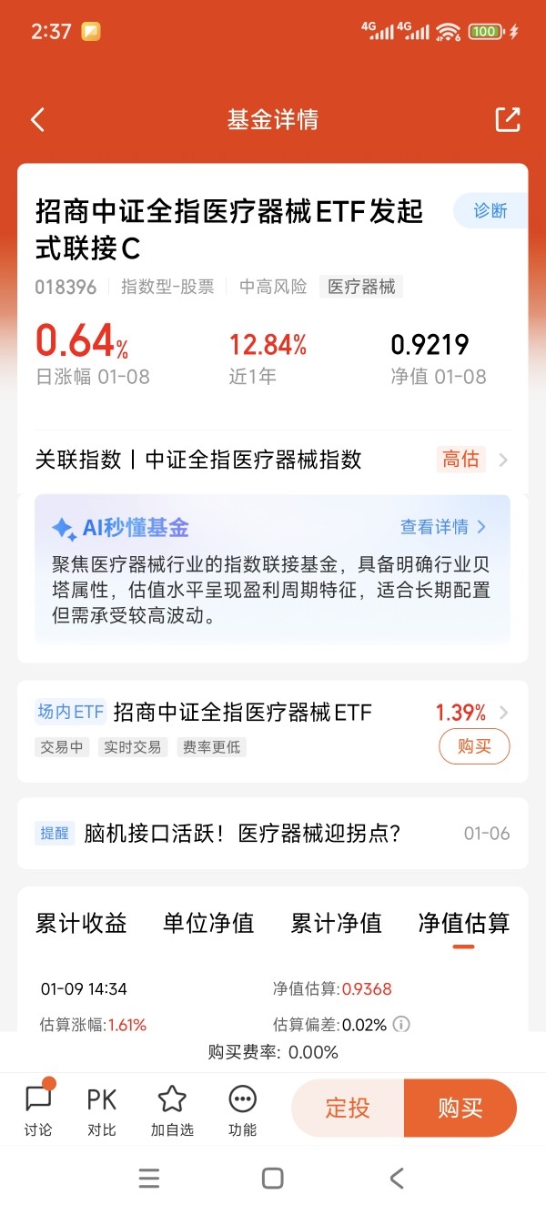$招商中证全指医疗器械ETF发起式联接C$ 这只聚焦医疗器械的指数基金。紧密跟踪中证全指医疗器械指数。全面覆盖医疗产业链。基金跟踪指数的精准度一直高。昨天上涨了0.64%。目前医疗器械指数还在历史低位,资金还在加速流入。今年有望创出新高。