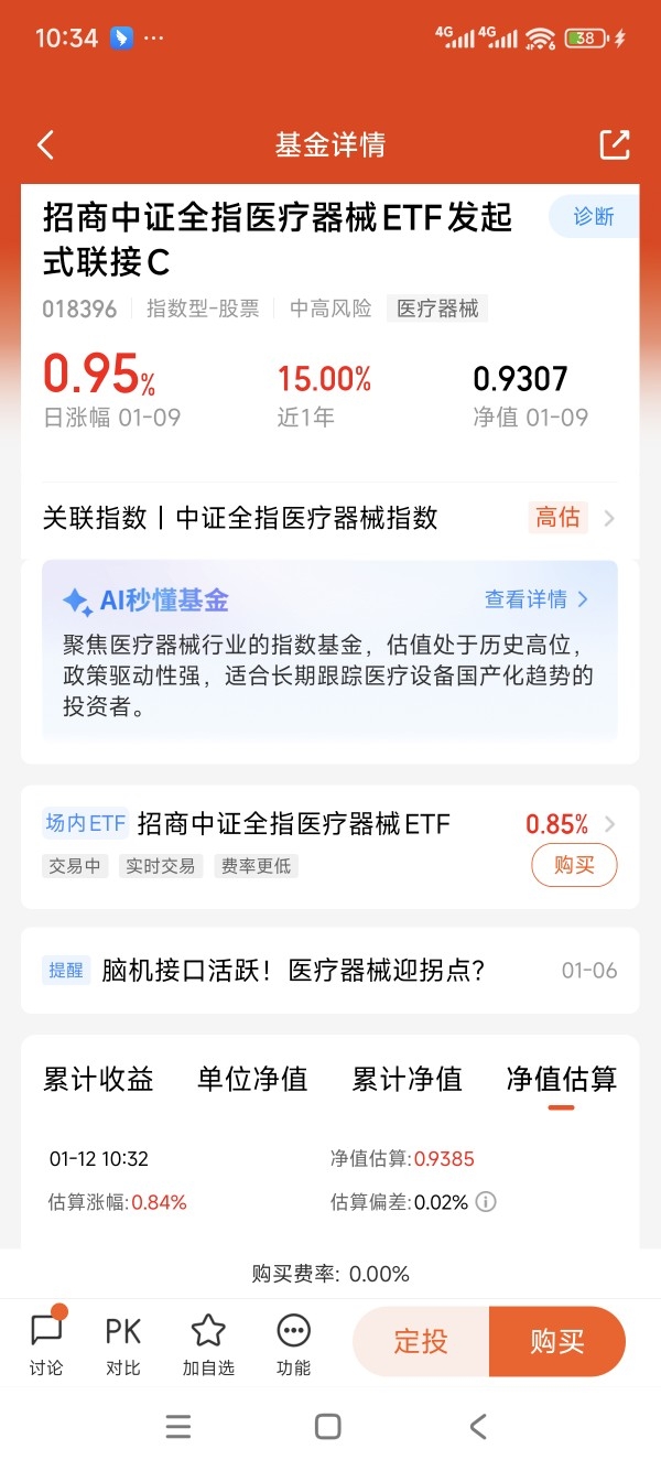 $招商中证全指医疗器械ETF发起式联接C$ 这只聚焦医疗器械的指数基金。紧跟中证全指医疗器械指数。指数涵盖的个股也包含了脑机接口领域,全面覆盖了医疗器械的产业。周五上涨了0.95%,今天的估值又是接近一个点,目前来看,医疗器械整体位置低。今年成长的空间大。