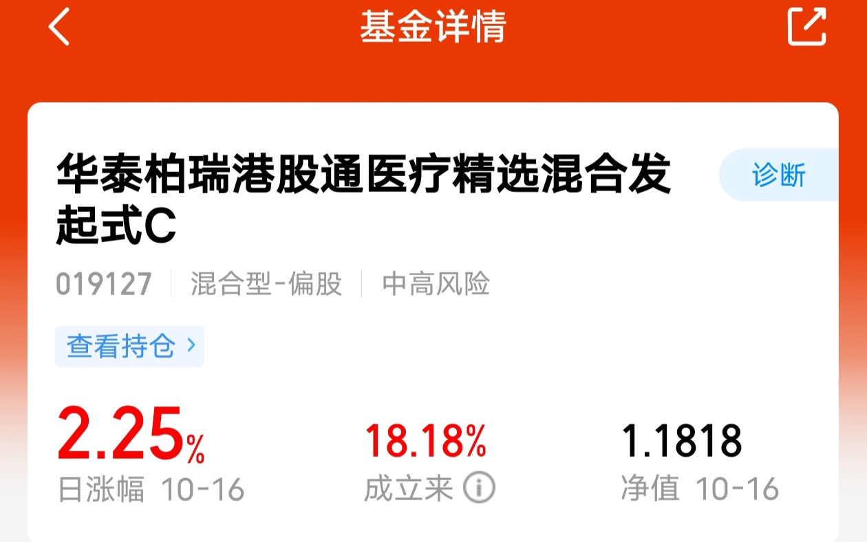 $华泰柏瑞港股通医疗精选混合发起式C$今日表现强劲,大涨2.25%,录得两连阳。